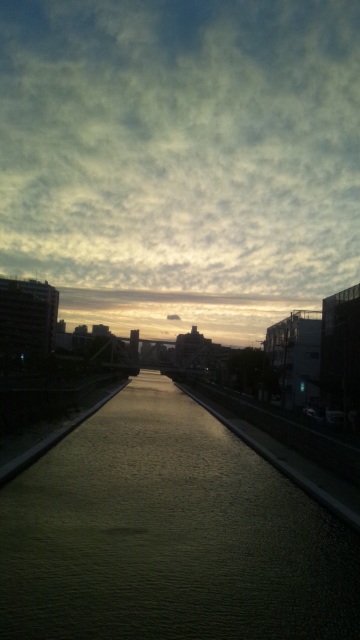 近所の橋の上からみた夕日とウロコ雲。